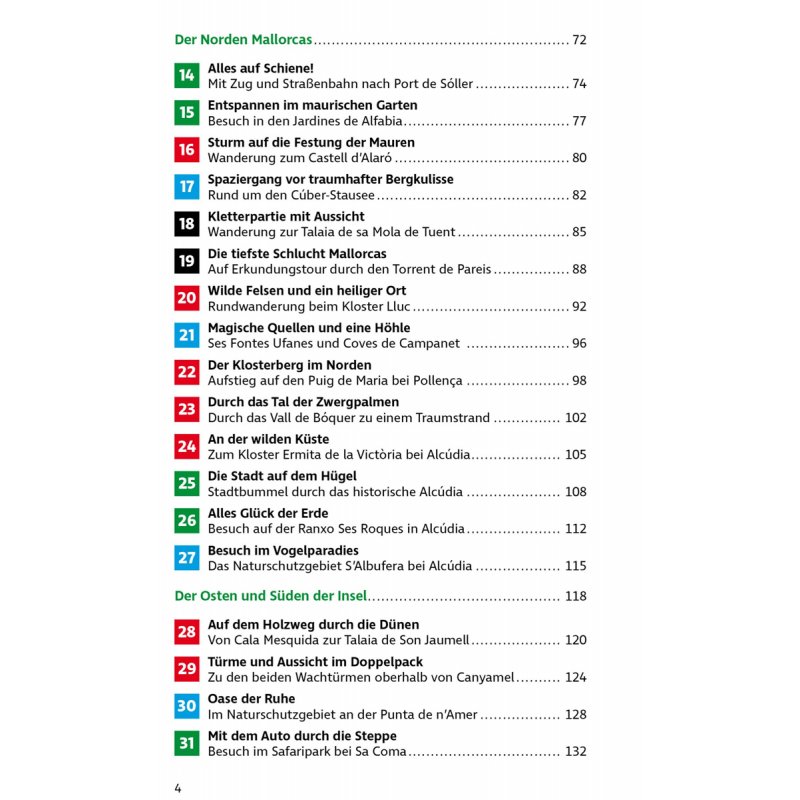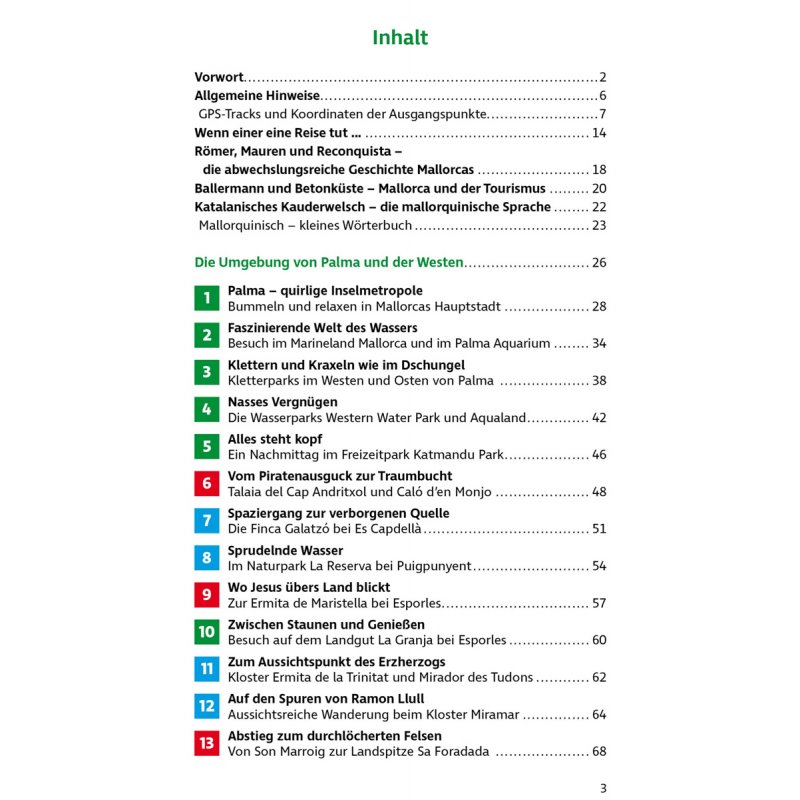 Wer nach Wandermöglichkeiten in wildromantischer, unberührter Natur sucht, findet nur wenige Kilometer von der lebhaften Inselmetropole Palma entfernt in der Serra de Tramuntana atemberaubende Felslandschaften, tiefe Schluchten und grandiose Ausblicke, die auch Kinder begeistern. Wachtürme aus vergangenen Tagen und Tropfsteinhöhlen wollen erforscht werden. Alte Herrschaftshäuser, Gärten aus maurischer Zeit, Schlösser, Burgen und Klöster wecken den Entdeckergeist der Kinder. Neben Wanderungen werden auch zahlreiche Ausflüge zu Freizeitparks, Kletter- und Wasserparks sowie Tierparks und Aquarien vorgestellt, sodass garantiert keine Langeweile aufkommt.