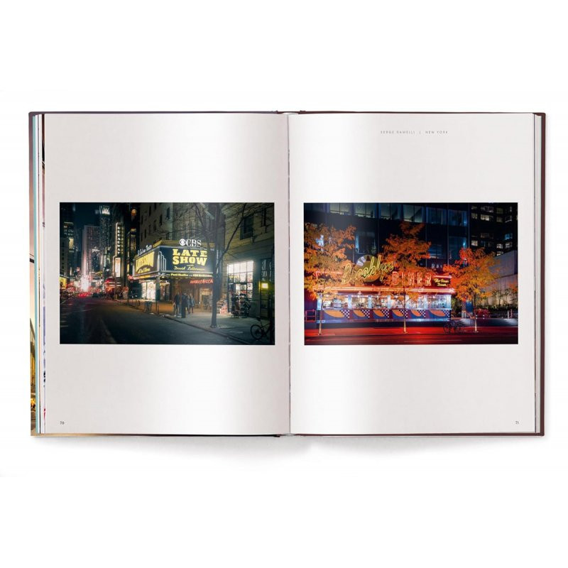 In Serge Ramellis Fotos spielen Menschen eine eher untergeordnete Rolle. Worauf es ankommt ist das Setting, die Stimmung, das Licht, die Umgebung. Typische Elemente und Sehenswürdigkeiten werden stets so abgebildet, wie sie kein Stadtbesucher jemals gesehen hat, es sei denn in seinen Träumen – oder in einem Film. Denn das ist es, was Ramelli meisterhaft beherrscht: alltägliche Szenen zu filmischen zu erhöhen. So schaut man gebannt auf die Kulisse, die sich einem offenbart. Was wird im nächsten Moment passieren? Oder verändern sich erst einmal nur die bunten Schattierungen, die die vorübergehende Morgenröte hervorruft? Wer Ramellis Schwarz-Weiß-Fotografien von New York bereits kennt, wird überrascht sein, welche Seite sich ihm von der Stadt nun in Farbe offenbart. Wie gehighlightet erscheinen die Yellow Cabs und Ampeln, natürliches und künstliches Licht treten in Konkurrenz zueinander. Times Square, Broadway, Empire State Building, Freiheitsstatur, jeder hat zu den vielen Ikonen, die diese Stadt ihr eigen nennt, durch ein Buch, einen Film, einen Song oder vielleicht einen Besuch dort eine andere, zumeist romantische Assoziation. Sie lässt sich garantiert in diesen Aufnahmen irgendwo entdecken. Bleibt die Frage, wann der Fotograf jene Momente erhaschen konnte, die uns diesen facettenreichen Trip durch die Stadt ermöglichen. Auch wenn es sein Geheimnis bleibt, jedenfalls bietet das Buch wieder ganz großes Kino, nun endlich auch in Farbe.