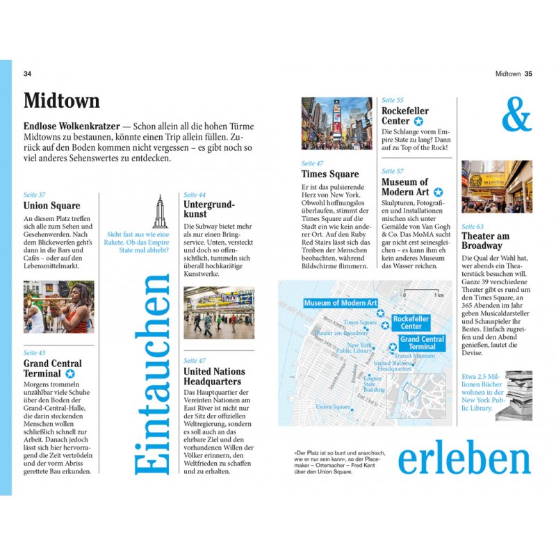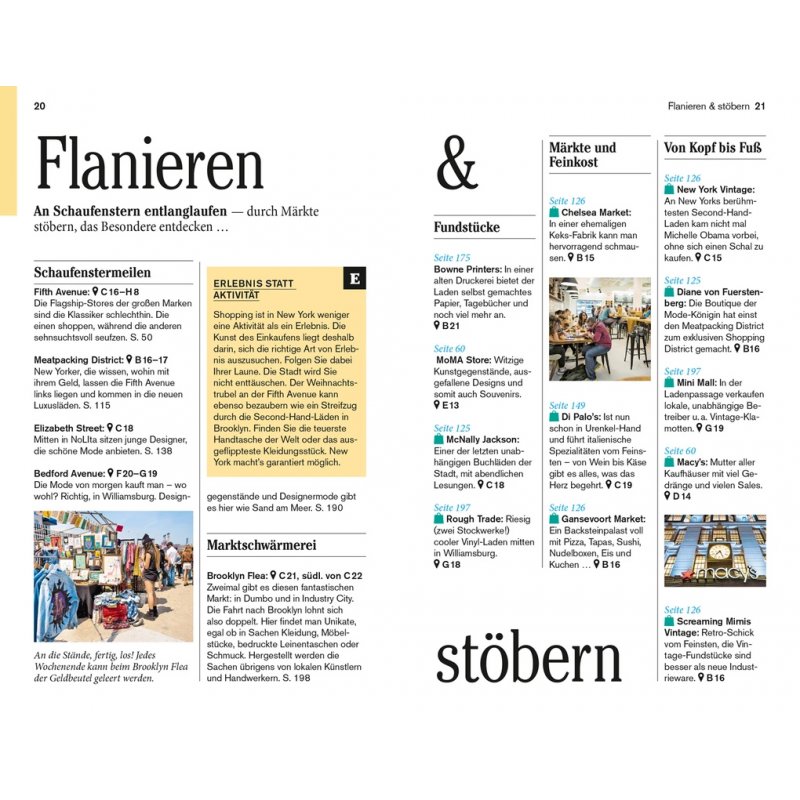 Senkrechtstarter, Überflieger, Kreuz und quer, Stadtlandschaften. Ausgewählte Adressen: Essen ist mehr als satt werden, Flanieren & stöbern, Diese Museen lieben wir!, Nachtschwärmereien, Wo du schläfst, bist du zu Hause. Vor Ort die Stadtviertel samt persönlichen Adresstipps: Midtown, Uptown, Harlem und der Norden Manhattans, Downtown West, Downtown East, Lower Manhattan, Brooklyn, Queens, Bronx und Hudson Valley. Das Kleingedruckte (Reiseinfos von A bis Z). Das Magazin. Offene Fragen.