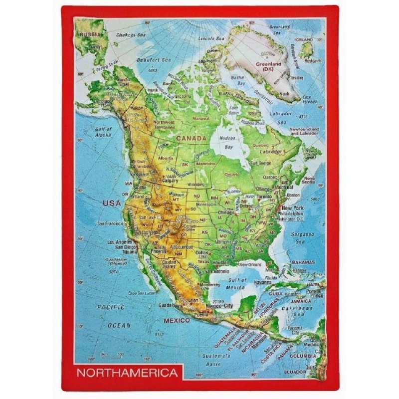 Auf der Bildseite befindet sich eine Nordamerikakarte mit ''Hubbeln'' zum Fühlen und anschaulichem Erkennen der Höhenreliefs des Landes.