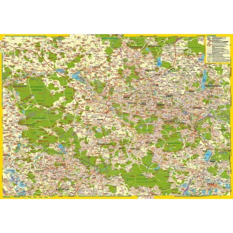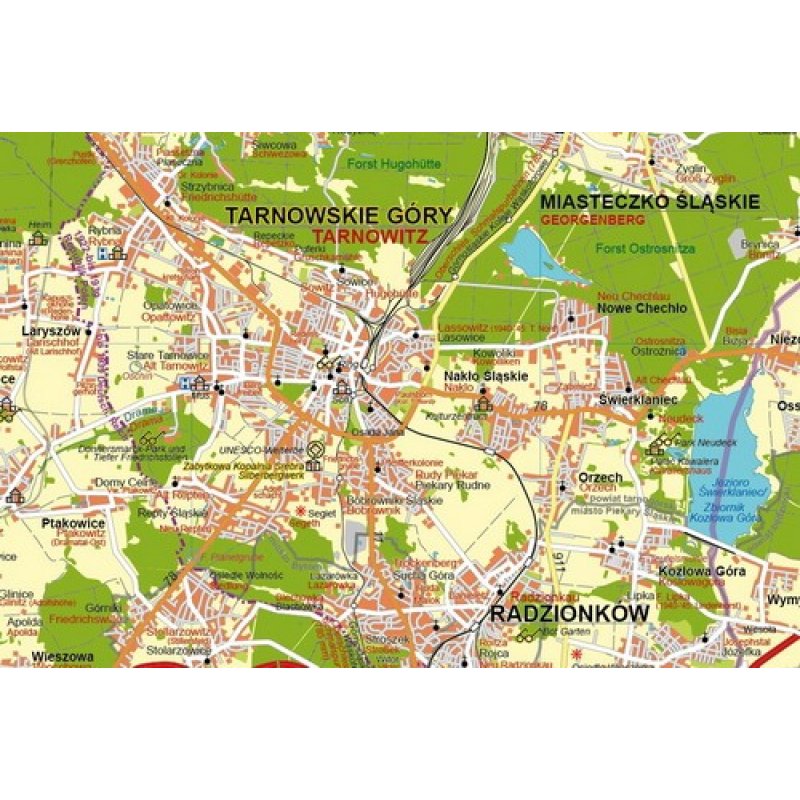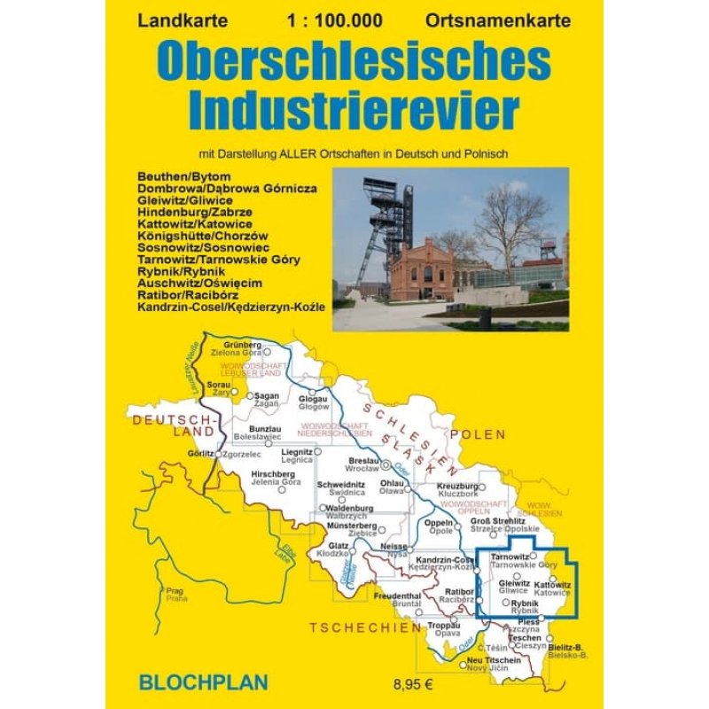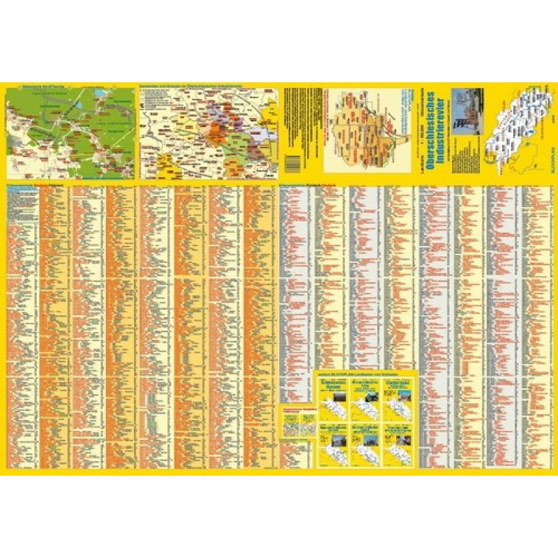 Die Landkarte “Oberschlesisches Industrierevier” zeigt (unter anderem) ein Gebiet, das seit 200 Jahren stark vom Bergbau und der darauf aufbauenden Industrie geprägt wurde. Städte wie Gleiwitz/Gliwice, Beuthen/Bytom oder Kattowitz/Katowice sind nur 3 von 14 größeren Städten und 13 weiteren Gebietseinheiten, die zusammen mit 2,7 Millionen Einwohnern den zweitgrößten Ballungsraum Polens bilden. Ein dichtes Nebeneinander von Wohn- und Industriegebieten, durchzogen von einem Gewirr aus Eisenbahnstrecken, Straßen und Wasserwegen ist vergleichbar mit dem Ruhrgebiet. Und wie auch dort, findet hier in den letzten Jahren ein Bedeutungs- und Nutzungswandel statt. Der Bergbau geht zurück und viele oberirdische Flächen werden neu genutzt, während man gleichzeitig die besondere Ästhetik der Industriebauten und Bergbautechnik erkannt hat und mehrere hochinteressante Museen (einschließlich der UNESCO-Welterbestätte Silberbergwerk in Tarnowitz/Tarnowskie Góry) entstanden sind.