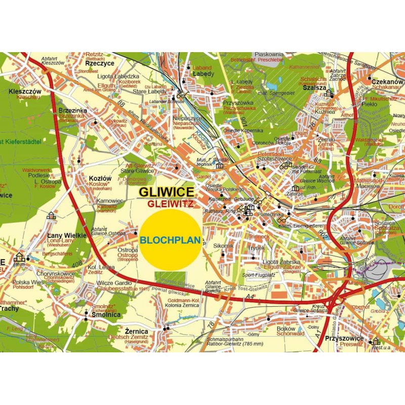 Aktuelle und detaillierte Landkarte vom schlesischen Gebiet rund um Kattowitz/Katowice zwischen Kandrzin-Cosel, Tarnowitz, Ratibor und Auschwitz/Oswiecim