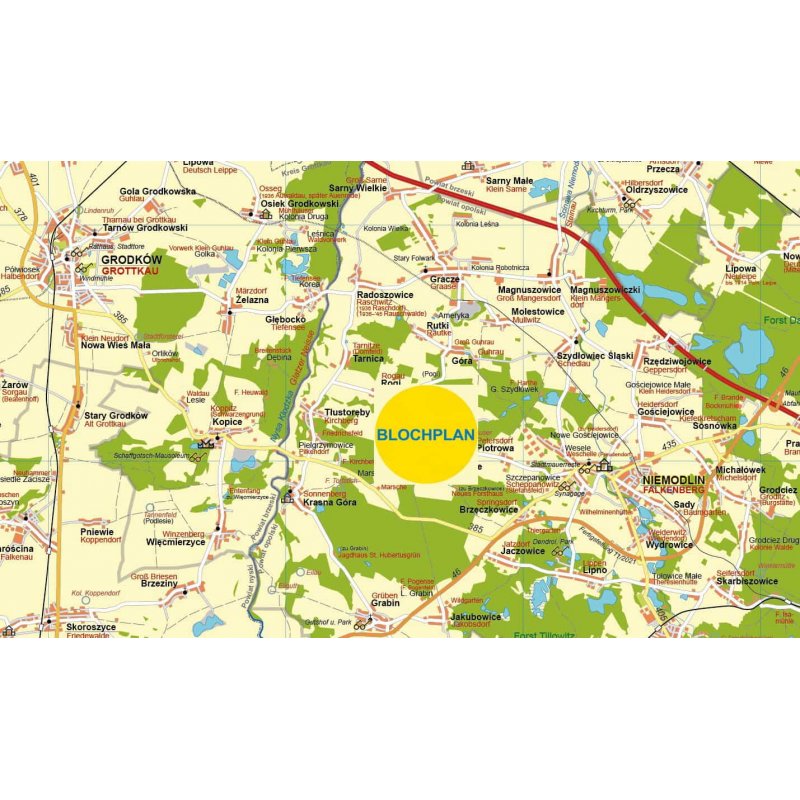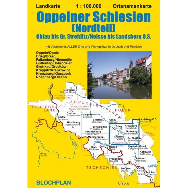 Nahebei liegt die bedeutende Industrie- und Universitätsstadt Oppeln/Opole, die durch ihre Lage an der Oder (Titelfoto ist die Gebäudegruppe “Oppelner Venedig”), durch ihre Kirchen und Museen, den Ring mit Rathaus und ihre Oderinseln Pascheke und Bolko mit vielen touristischen Highlights aufwartet. Detailliertere Informationen über die Stadt und ihre Geschichte gibt der auch bei BLOCHPLAN erschienene vergleichende Stadtplan “Oppeln 1938/Opole heute” von dem ein Innenstadtausschnitt auf der Rückseite der Karte wiedergegeben wird.