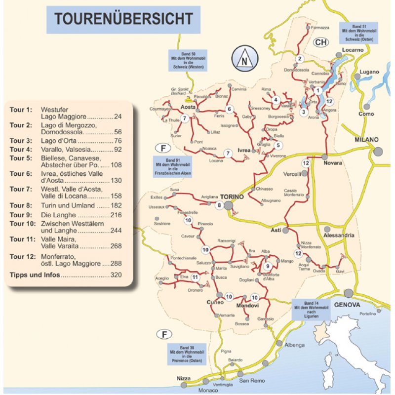 Folgen Sie uns auf 12 sorgfältig recherchierten Touren, entlang der Seen, ins Gebirge und durch die Langhe. Orientieren Sie sich mit Übersichtskarten zu allen Stell- und Campingplätzen, Ver- und Entsorgungsstationenund den empfohlenen Reiserouten.