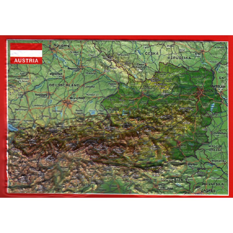 Auf der Bildseite befindet sich eine Karte von Österreich mit ''Hubbeln'' zum Fühlen und anschaulichem Erkennen der Höhenreliefs des Landes.