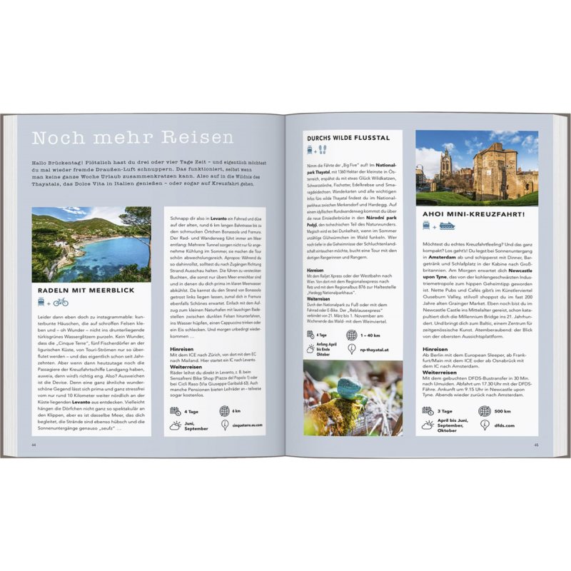 EUROPA UNGEWÖHNLICH ERLEBEN, nachhaltig und ganz ohne Flug? Wie wäre es zum Beispiel mit Inselhüpfen per Fähre in Griechenland? Radelnd das romantische Cornwall erkunden? Oder mit einen Motorroller-Kurztrip durch hübsche Kleinstädte in Belgien düsen? Dieses Buch nimmt mit auf 30 spannende und einzigartige Trips quer durch Europa, die man so in keinem Reisebüro buchen, aber ganz mühelos nachreisen kann. Praktische Tipps zur fluglosen An- und Abreise, Schritt-für-Schritt-Beschreibung der Route sowie Vorschläge für Aktivitäten vor Ort machen die Planung leicht. Für noch mehr Inspiration sorgen im Kapitel „Mehr davon“ rund 20 weitere Ideen für klimaschonenden Urlaub - und zahlreiche tolle Fotos, die schon beim Durchblättern die Reiselust wecken.