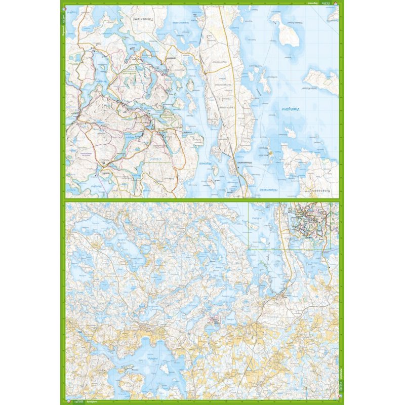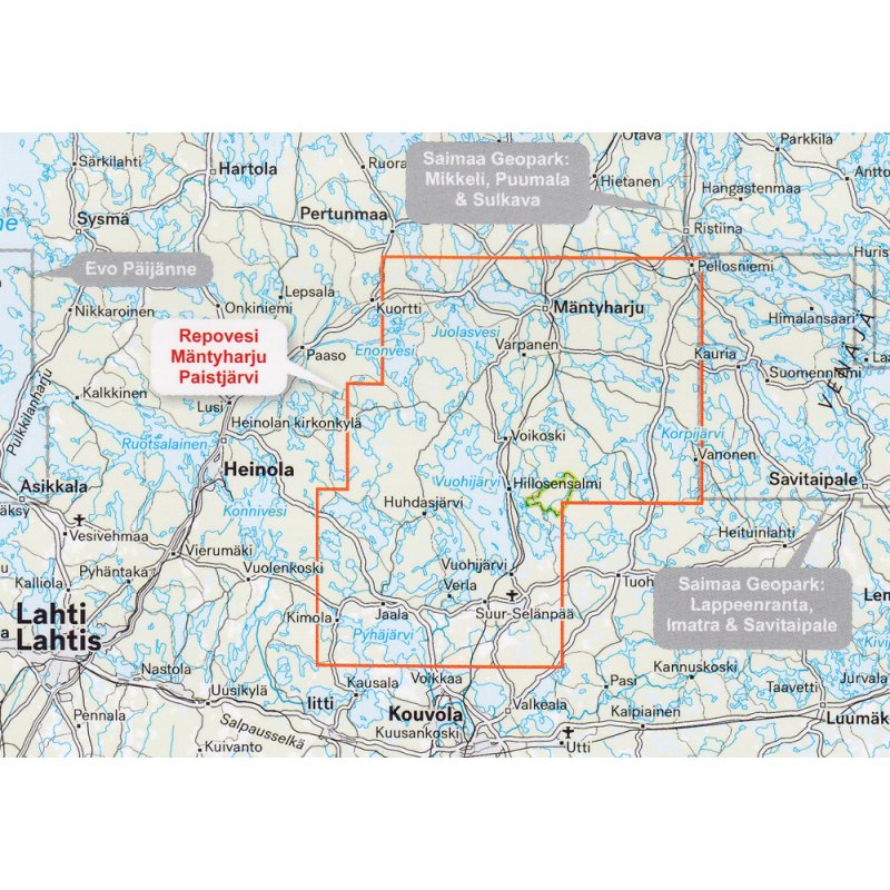 Wandern, Radfahren und Kanufahren. Die preisgekrönten Wanderwege von Mäntyharju führen ins Herz des Nationalparks Repovesi, wo der beliebte Ketunlenkki und die anspruchsvolle Kaakkuri-Runde verlaufen. Die Karte umfasst außerdem den See Vuohijärvi. Die Karte ist auf hochwertigem reiß- und wasserfesten Tyvek-Material gedruckt. Sie brauchen die Karte also nicht vor Regen zu schützen, und sie reißt auch nicht ein, wenn Sie sie benutzen. Der Hersteller garantiert, dass das Material 20.000 Mal gefaltet werden kann. Dank des ausgeklügelten Layouts finden alle wichtigen Ziele der Region auf einer Karte Platz.