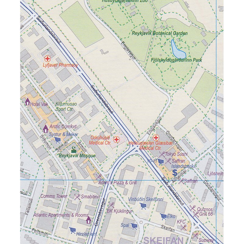 Description by ITMB: Reykjavik is the capital of Iceland and is an interesting city in its own right. We have placed it on one side of the sheet and it looks very good. It includes the international airport (the port of entry for almost everyone visiting Iceland) and includes a good range of hotels, which is very necessary, due to the country's booming tourism industry. The central core of the city is well-portrayed and the scale is such as to allow us to impose 'footprints' of all the buildings in the city. We have also added a listing of the top attractions within the city area, such as the largest church in Iceland, the Jonnsson Sculpture Garden, and the historic Old Harbour. The reverse side of the map covers essentially the southwestern quarter of Iceland, from Keflavik in the far west to partway across the vast Vatnajokull Icefield and north to the town of Stykkisholmur. The map shows all known places of accommodation, including youth hostels, and touristic attractions such as the famous Geysir, the volcanic water eruption that occurs every six minutes and is a 'must see' for everyone visiting the country. The map also shows the most popular attractions on the island, including the Golden Circle Route of 300 kms through Pingvellir National Park and the Gullfoss waterfall area. This is an excellent map for those concentrating on this portion of Iceland. We have visited all of these attractions and can guarantee that Iceland is a marvelous travel destination.