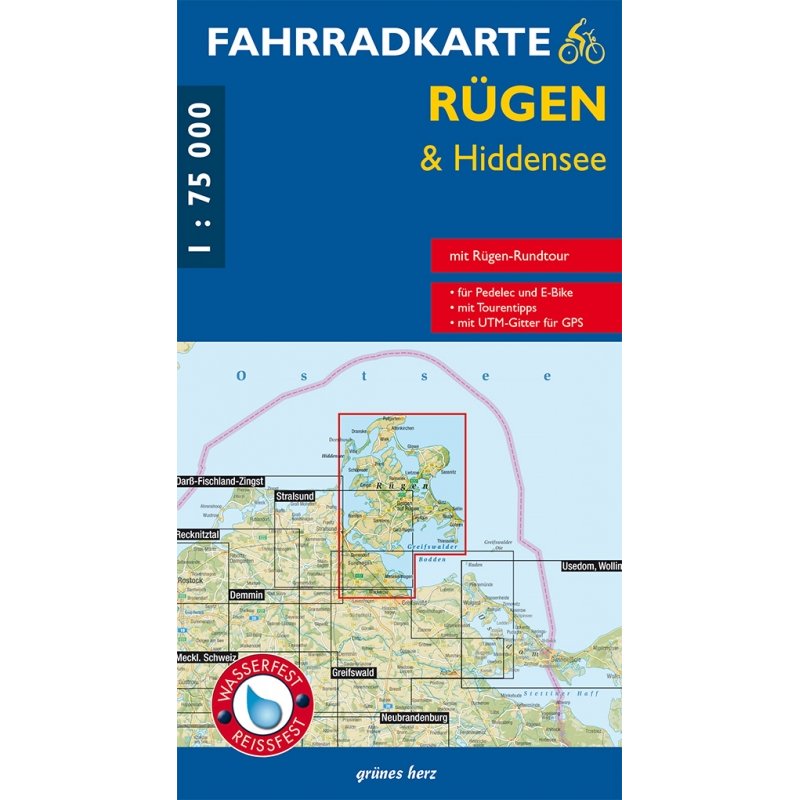 Die Fahrradkarte stellt die gesamte Insel Rügen, die Insel Hiddensee sowie Stralsund im Maßstab 1 : 75.000 dar. Die topographische Karte enthält das regionale Radwege- und Radroutennetz mit Angaben zu Markierung, Oberflächen und Entfernungen. Der Verlauf der durch die Region führenden Radfernwege wurde besonders hervorgehoben. Die Karte weist auf Abschnitte hin, an denen sich eine gemeinsame Nutzung mit einem stärkeren Kfz-Verkehr nicht vermeiden lässt bzw. welche abzuraten sind. Lohnenswerte touristische Ziele und Sehenswürdigkeiten sind durch Symbole gekennzeichnet und beschriftet. Der farbig bebilderte Rückseitentext beschreibt die touristisch interessanten Orte und gibt Tourentipps.