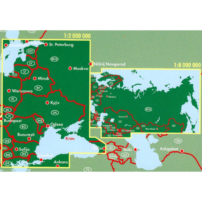 - Kartenbeschriftung in lateinischer Schrift, Russland: die größeren Orte auch in kyrillischer Schrift