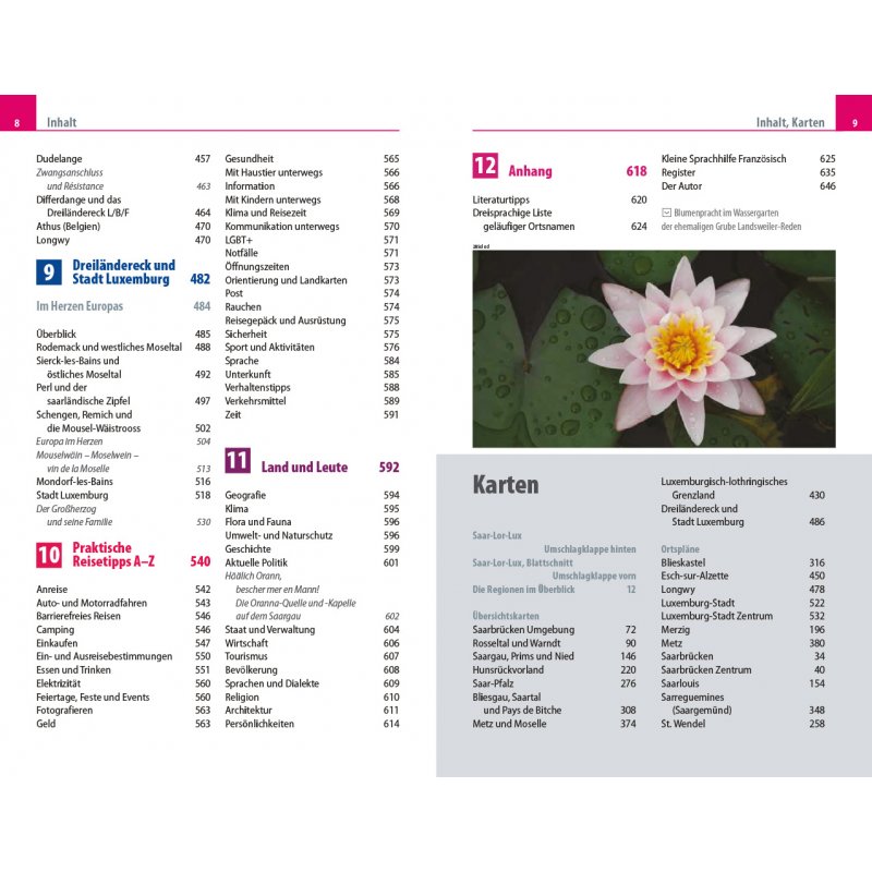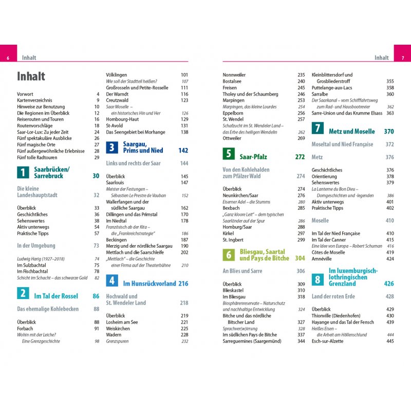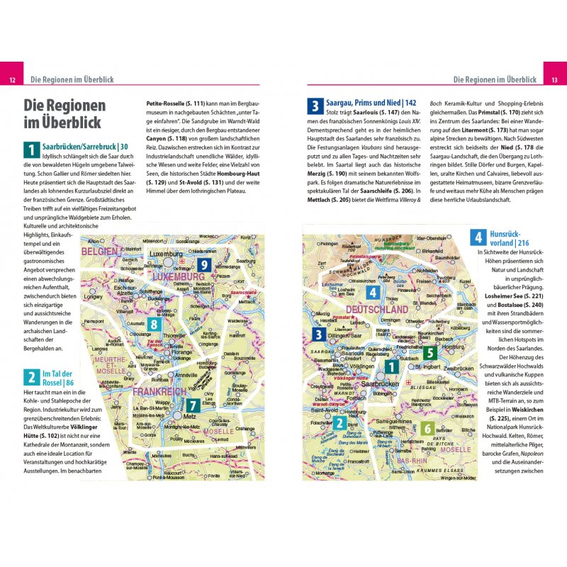 - Übersichtsseiten mit Beschreibungen aller Regionen: Saarbrücken, Sarrebruck, Tal der Rossel, Saargau, Prims und Nied, Hunsrückvorland, Saar-Pfalz, Bliesgau, Saartal und Pays de Bitche, Metz und Mesolle, Luxemburgisch-Lothringisches Grenzland, Dreiländereck, Luxemburg Stadt