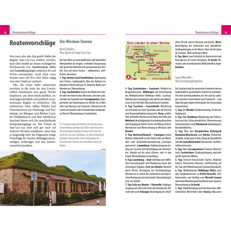 Saarland, Lothringen und Luxemburg – wo sonst, wenn nicht hier, wo an den Ländergrenzen von Frankreich, Luxemburg, Deutschland und Belgien verschiedene Kulturen und Sprachen aufeinander treffen, lässt es sich vielfältig reisen? Das Dreiländereck mit dem südlichen Zipfel Belgiens ist geprägt von Kohle, Eisen und Minette. Es ist aber auch eine Region urwüchsiger Wälder und abenteuerlicher Felsen, idyllischer Flüsse und Seen und aussichtsreicher Höhen. Und nicht zuletzt ist es eine Region voller Zeugnisse über die wechselvolle Geschichte zwischen Deutschland und Frankreich.