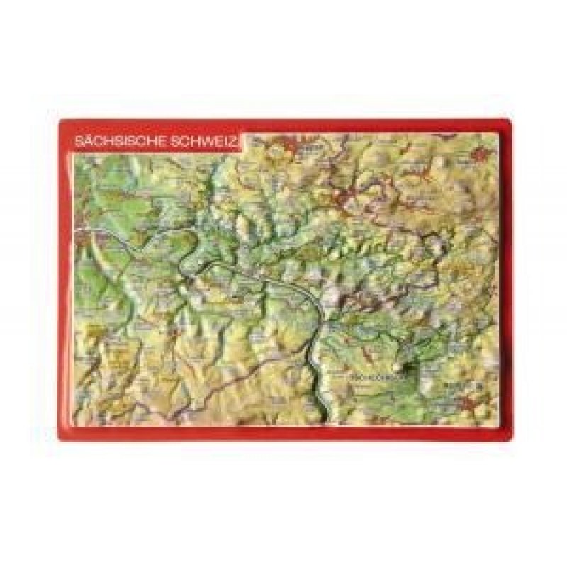 Auf der Bildseite befindet sich eine Reliefkarte von der Sächsischen Schweiz mit ''Hubbeln'' zum Fühlen und anschaulichem Erkennen der Höhenreliefs des Landes.