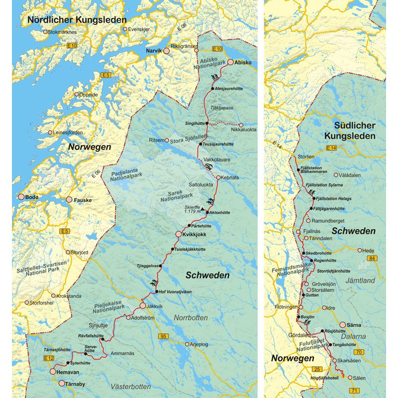 - Ausführliche Beschreibung des 453 km langen nördlichen Kungsleden und des 353 km langen südlichen Kungsleden (ab südlich von Grövelsjön identisch mit dem E1)