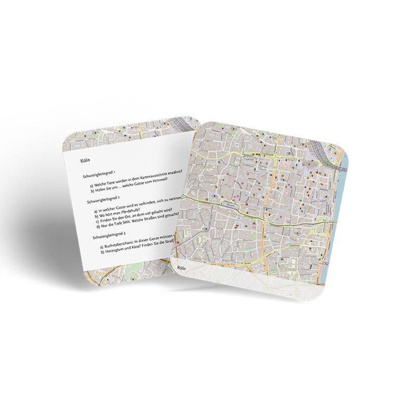 Mit Stadtplänen aus Papier hantiert zu Zeiten des Navis kaum noch jemand – doch wer sich die Fähigkeit des Kartenlesens erhalten hat, ist beim Stadtkarten-Quiz klar im Vorteil. Anders als in den meisten Quizspielen geht es hier nämlich nicht um Wissen oder gutes Bauchgefühl beim Raten, sondern um genaues Hinsehen und das Entschlüsseln von Hinweisen à la „asketische Kresse“ oder „hier wird gut gebrüllt“. Die Antworten auf die acht bis neun Fragen jeder Fragekarte bestehen nämlich in nichts anderem als den Namen der Straßen, Flüsse und Plätze, die auf den 33 zugehörigen Kartenausschnitten zu finden sind. Damit Sie diese gut erkennen können, hat das Spiel ein etwas größeres Format als unsere anderen Kandidaten im Quiz-Bereich. Also legen Sie los, ob alleine oder zu zweit bis viert, und entdecken Sie die Großstädte Deutschlands, von Aachen über Kiel bis Wuppertal.