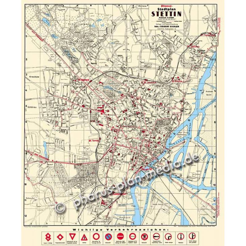 Vorderseite: Stadtplan Stettin mit Wendorf, Pommerensdorf, Schwarzow, Schönau, Kreckow, Nemitz, Züllchow, Zabelsdorf sowie den Bahnhöfen Haupt-Bf., Torney, Westend, Zabelsdorf, Bredow, Züllchow, Frauendorf, Pommerensdorf.