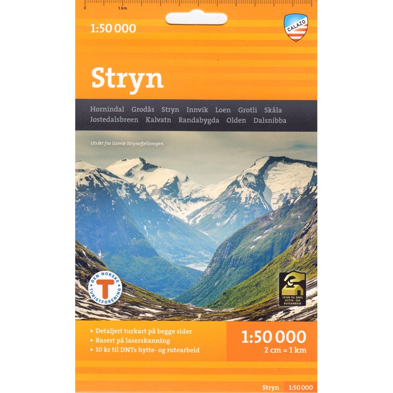 Mit Kartenansichten auf der Vorder- und Rückseite deckt diese Karte das Gebiet um Stryn und Strynefjellet ab. Zu den klassischen Ausflugszielen in der Region zählen unter anderem Skåla, Briksdalen und Gamle Strynefjellsvegen.