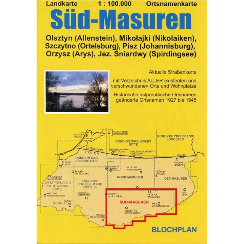Die Karte stellt den Süden Masurens und einen kleinen Teil des Ermlands - den Bereich zwischen den Städten Sensburg/Mragowo, Arys/Orzysz, Johannisburg/Pisz und Ortelsburg/Szczytno dar. Die boomende Woiwodschaftshauptstadt Allenstein/Olsztyn ist mit ihrem östlichen Umfeld am Übergang zur Folgekarte (Ermland/Oberland) dargestellt, während der neue Flugplatz Olsztyn-Mazury ca. 50 Km entfernt nahe der Stadt Ortelsburg/Szczytno liegt. Die jahrhundertealte Südgrenze Ostpreußens - die mit der heutigen Woiwodschaftsgrenze fast identisch ist, markiert den unteren Kartenrand. Bekannte masurische Urlaubsziele wie Nikolaiken/Mikolajki oder Ukta, die bei Wasserwanderern beliebte Krutynia/Kruttinner Fließ, das "Masurische Meer" - der Spirdingsee/Jezioro Sniardwy, die endlosen Wälder der Johannisburger Heide/Puszcza Piska oder auch das Geburtshaus von Ernst Wiechert in Kleinort/Pierslawek sowie Hinweise auf besondere Sehenswürdigkeiten wie Herrenhäuser, Burgen und Kirchen, beliebte Paddelrouten aber auch ausgewählte Radrouten bilden eine gute Grundlage für Reisevorbereitungen in die Urlaubslandschaft Masuren. Die Landkarte enthält ALLE in diesem Gebiet vor 1945 vorhandenen Orte und Wohnplätze (darunter zahlreiche Förstereien mit eigenem Wohnplatzstatus), die jeweils mit ihrem historischen Namen, dem ggf. zwischen 1927 und 1945 germanisierten Namen und mit den aktuellen Namen in polnisch bezeichnet werden. Von den hier einst vorhandenen ca. 1030 Orten und Wohnplätzen erhielten ab 1927 insgesamt 379 Orte (davon im Jahr 1938 311) eingedeutschte Namen, weil z.B. "Bialla" (ab 1938 Gehlenburg) nicht deutsch genug klang. Nach der Vertreibung eines Großteils der Bevölkerung ab 1945 erhielten alle Orte neue Namen, die zum großen Teil Übersetzungen aus dem Deutschen ins Polnische sind, bzw. die sich wieder an die masurischen Ursprungsnamen anlehnen. Im Gegensatz zum heute russischen Teil Ostpreußens oder weiter nördlich gelegenen heute polnischen Gebieten ist ein Großteil der früheren Orte noch vorhanden. "Verschwunden" sind lediglich 175 (17 %) vor allem kleinere Orte und Wohnplätze, deren Standort aber in der Karte zusammen mit dem/den historischen Namen verzeichnet ist. Zur besseren Orientierung sind neben den Straßen und befahrbaren Wegen noch die aktuellen aber auch die stillgelegten Eisenbahnstrecken und die Kreisgrenzen von 1937 dargestellt. Auf der Rückseite enthält die Karte Ortsverzeichnisse in Deutsch-Polnisch und Polnisch-Deutsch.