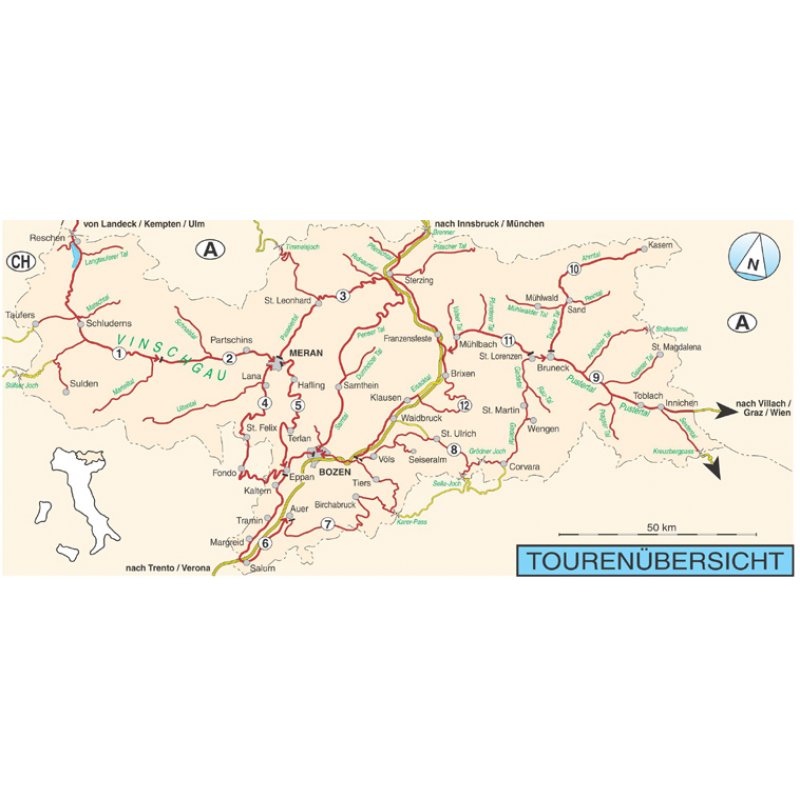Über<2000 km Südtirol in 12 Touren (rot marliert) zu den bekanntesten und vielen unbekannten Sehenswürdigkeiten. Genauer Markierung vieler Stell-, Bade-, Picknick- und Wanderparkplätze, Toiletten, Ver- und Entsorgungsstationen, Trinkwasserstellen sowie der schönsten Campingplätze.