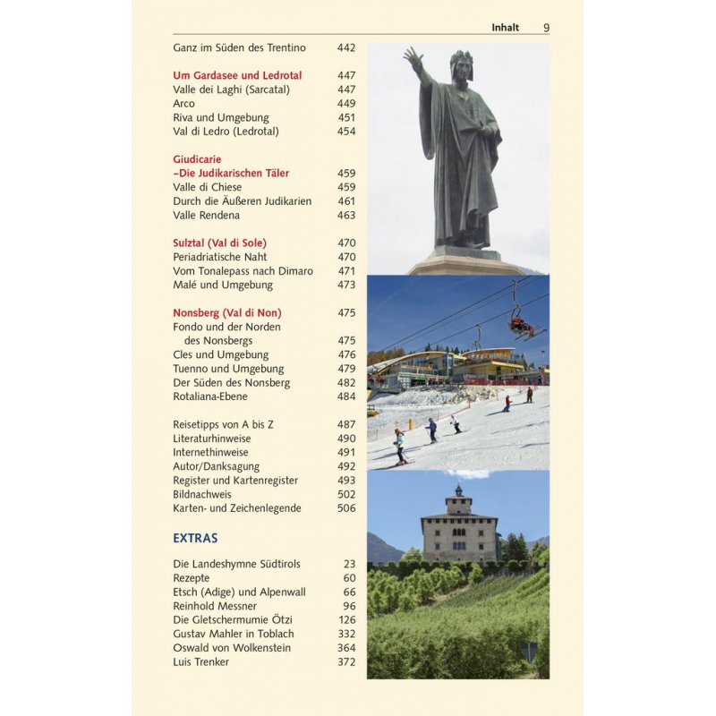 Im Trescher-Reiseführer SÜDTIROL UND TRENTINO werden alle Sehenswürdigkeiten und Attraktionen, Natur- und Kulturschätze umfassend beschrieben. Das Buch lockt in beschauliche Dörfer und Städtchen, stellt die große Zahl Burgen und Schlösser vor und begleitet schließlich von Südtirol ins Trentino über Trient und das heitere Rovereto zum Gardasee. Neben einer ausführlichen Landeskunde und fundierten Hintergrundinformationen zu Geschichte, Küche, Kunst und Kultur finden sich umfangreiche praktische Tipps zum Reiseziel, die besten Restaurant- und Hotelempfehlungen sowie viel Wissenswertes für Aktivferien. 25 Stadtpläne und Übersichtskarten ergänzen diesen 504 Seiten starken Reiseführer.