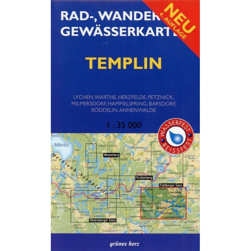 Die Rad,- Wander- und Gewässerkarte setzt die 1997 mit dem Blatt "Müritz" begonnenen Serie im Maßstab 1:35.000 fort. Sie wurde nach geographischen, landschaftlichen und touristischen Aspekten erarbeitet. Die Stadt Templin liegt zentral in der Kartenmitte. Der Kartenauschnitt reicht von Lychen, Warthe und Jakobshagen im Norden bis nach Hammelspring und Ahlimbsmühle im Süden, von Lychen und Barsdorf im Westen bis nach Petznick und Milmersdorf im Osten. Der Maßstab von 1:35.000 gibt Raum für eine hohe Genauigkeit und Detailtreue. Neben der exakten Wegezeichnung von Wanderwegen und den in die Oberflächenqualitäten unterschiedenen Radwanderrouten sind die Informationen zur örtlich gegebenen touristischen Infrastruktur eingetragen. Zusätzlich finden Wasserwanderer die nötigen Informationen über die Wasserstraßen, Wasserwanderrouten, Wasserwanderrastplätze, Schleusen sowie der Befahrbarkeit der Gewässer. Historisch und landschaftlich reizvolle Punkte, bekanntes und "Geheimtipps" - all das findet sich auf der Karte wieder. Auf der Kartenrückseite geben kurze Erläuterungen Auskunft zu den Orten und ihre Geschichte. Die Karte hat ein handliches Format (48 x 68 cm) und wurde auf einem wasser- und reißfesten Material gedruckt. Der Kartenname widerspiegelt bereits die Bedeutung der Stadt Templin in der besonders reizvollen Wald- und Seenlandschaft zwischen dem Naturpark Uckermärkische Seen und dem Biosphärenreservat Schorfheide. Ein Teilstück der Havel-Wasserstraße sowie eine Vielzahl lang gestreckter Seen, die teils wie an einer Perlenkette miteinander verbunden sind, machen diese Region geradezu erlebenswert - egal, ob als Wasserwanderer, Radler oder Wanderer. Templin mit seiner vollständig erhaltenen historischen Stadtmauer, der Westernstadt "Eldorado", der Basisstation Fahrraddraisine nach Fürstenberg der oder der Outdoor-Kart-Bahn ist ein lohnenswertes Ferienziel.