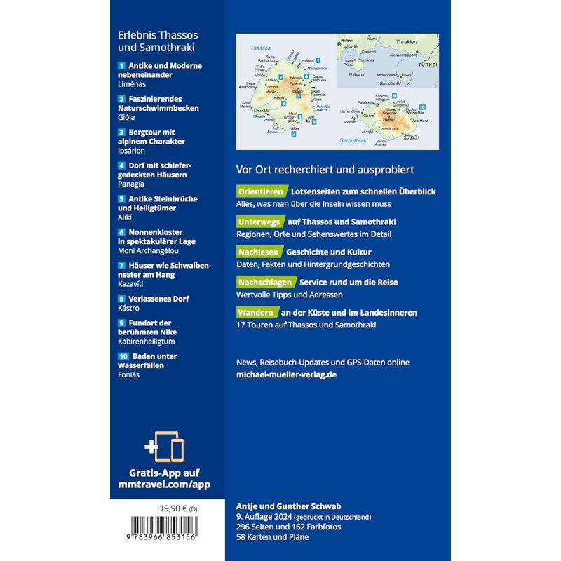 Die im Norden der Ägäis gelegenen Inseln werden oft mit grünen Smaragden verglichen. Mit ihren kristallklaren Bächen, ihren steilen Wasserfällen, den dichten Wäldern und riesigen Farnen erinnern insbesondere die Nordhälften der Inseln fast an tropische Urwaldlandschaften.Während das ruhige Samothraki besonders von eingefleischten Griechenlandfans besucht wird, magnetisiert das quirlige Thassos Urlauber aller Couleur. Badefans kommen ebenso auf ihre Kosten wie Wanderfreunde, denn neben vielen feinsandigen Stränden haben die Inseln Berge mit durchaus alpinem Charakter zu bieten.Antje und Gunther Schwabs Reisehandbuch enthält Wandervorschläge, weist auf die besten Bademöglichkeiten hin, bietet Tipps zum Übernachten, Essen und Trinken und gibt Anregungen für ein aufregendes Nachtleben. Die Palette reicht vom einfachen Privatzimmer bis zum Luxushotel und von der schlichten Dorftaverne bis zum Feinschmeckerrestaurant.