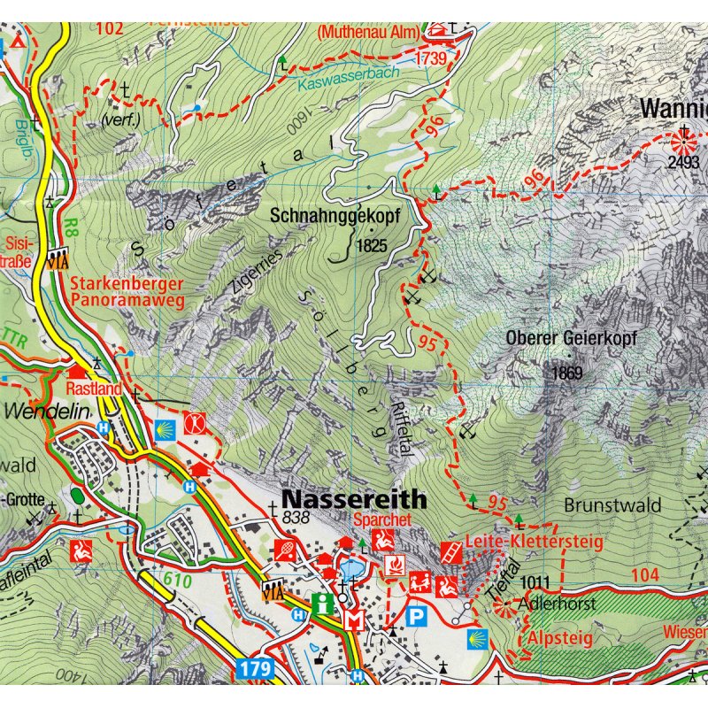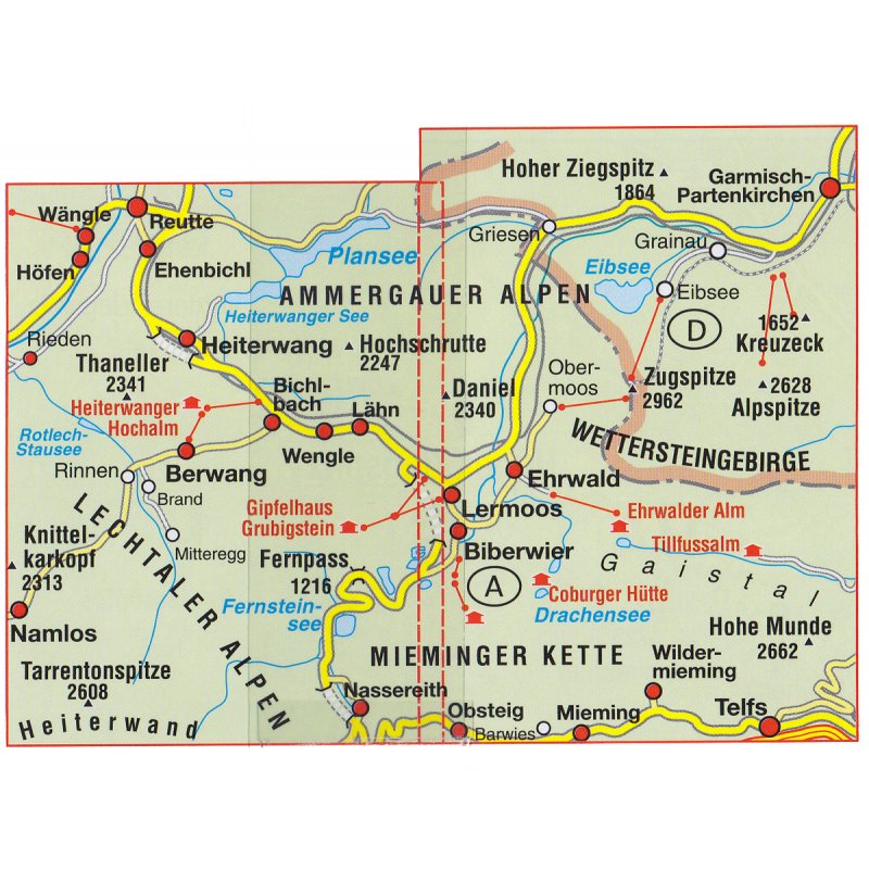 Die beiden Seiten dieser neuen Karte zeigen aber auch die angrenzenden Gebiete um Garmisch-Partenkirchen, Berwang und den Plansee, die östlichen Lechtaler Alpen und das Mieminger Plateau - mit allen Wanderwegen, Rad- und Mountainbikerouten, touristische Attraktionen, Hütten und Einkehrstationen, plastisch und im augenfreundlichen Maßstab 1:25 000.