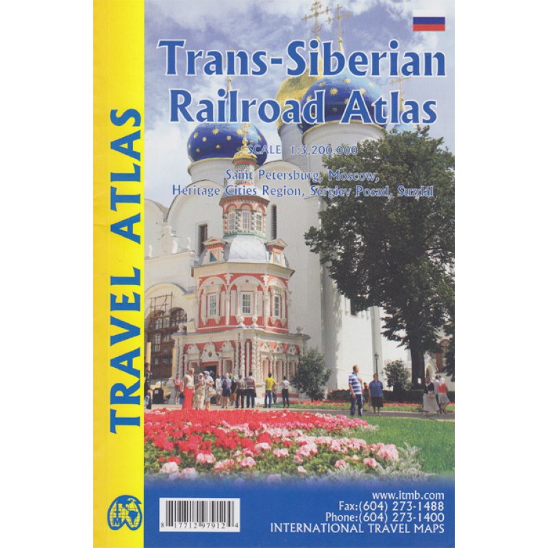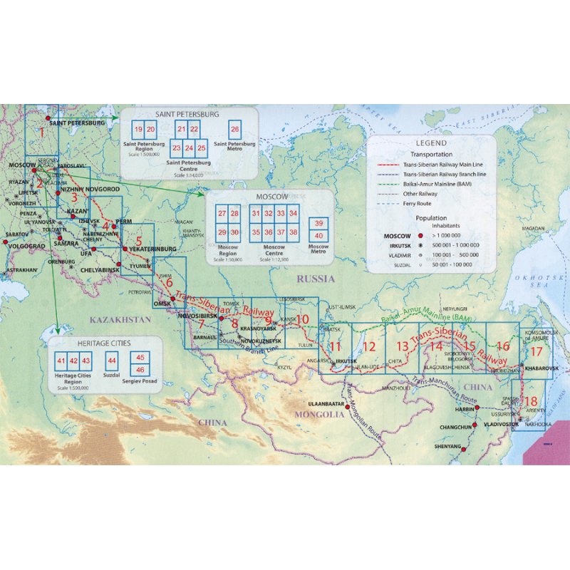 Description by ITMB: It is not often that one can publish a map that has never been done before. I seem to say that rather frequently! The Trans Siberian is one of the great railway trips of all time, crossing vast areas of steppe land and tundra as it wends its way from Moscow to Vladivostok. There are actually two routes for much of the western portion, and branch off lines to Mongolia and northern China in the east, as well as a very unusual route across the top of Lake Baikal called Amur, or BAM, line. The only effective way to show east-west trail networks this diverse is via an atlas and that is just what we have done. The entire route, with an extra page for those starting is via an atlas and that is just what we have done. The entire route, with an extra page for those starting in St. Petersburg is covered nicely, with inset pages showing St. Petersburg, Moscow, and the heritage cities of Sergiev Posad and Suzdal. Both branches of the Trans-Siberian are shown and most of the Baikal-Amur (BAM) line. This type of map has never been attempted before, so we are anxious to receive feedback.