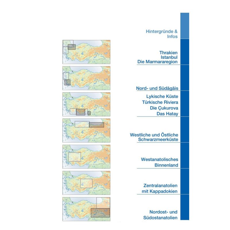 Knapp 1.000 Seiten Türkei: Von der Ägäis- und Mittelmeerküste über Istanbul, Inneranatolien und Kappadokien bis hin zur Schwarzmeerküste reicht der Blick des wohl detailliertesten Reisebegleiters zum faszinierenden Land zwischen Orient und Okzident. Im Mittelpunkt stehen Badestrände, Ausgrabungsstätten, kleine, abgeschiedene Dörfer, pulsierende Städte und Landschaften, wie sie grandioser kaum sein können. Dazu kommen akribisch recherchierte Hinweise zu allen reisepraktischen Fragen, mit deren Hilfe man sich auch im letzten Winkel des riesigen Landes gut zurechtfinden wird.