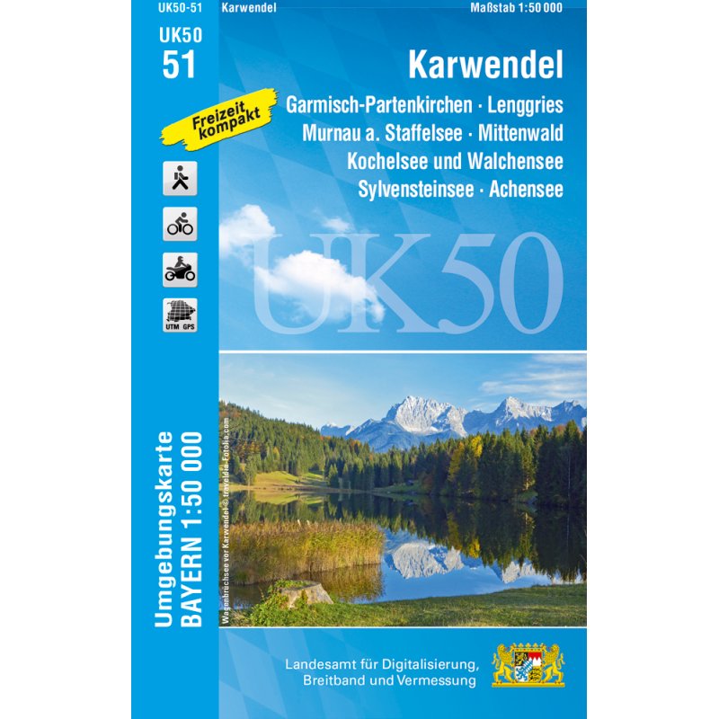 Das nördliche Karwendel, charakterisiert durch beeindruckend lange Täler und ebenso lange schroffe Bergketten mit berühmten Nordwänden, wird auf dieser Karte dargestellt; dazu das einsame Vorkarwendel und die malerische Soierngruppe, die schon König Ludwig begeisterte. Das Karwendel - ein Paradies für Wanderer, Mountainbiker und Kletterer - beherbergt auch den Isarursprung, den Großen Ahornboden mit der Eng und den Achensee. Auch die Gegend vom Geigenbauerörtchen Mittenwald bis hin nach Garmisch-Partenkirchen, mit sanften Erhebungen für Genusswanderer wie dem Kranzberg, den Buckelwiesen und vielen kleinen Seen findet man auf diesem Kartenblatt.