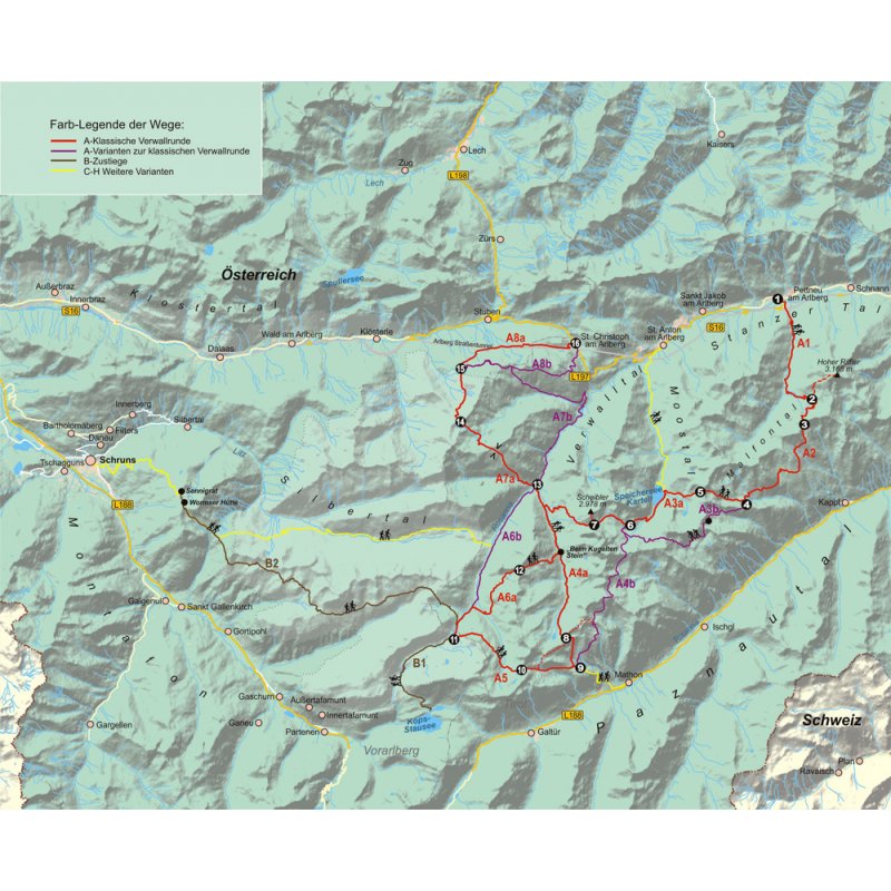 Das Verwall liegt zwischen den beiden bekannten Skiorten St. Anton am Arlberg und Ischgl. In acht Tagen können Sie in dem Gebirge mit seinen wilden Gipfeln und kleinen Gletschern auf einer traumhaften Runde von Hütte zu Hütte wandern. Dabei überwinden Sie knapp 75 km und über 6.000 Höhenmeter und erleben fantastische Ausblicke, ursprüngliche Berglandschaften und gemütliche Hütten. Eine detaillierte Beschreibung der Verwallrunde finden Sie in diesem Wanderführer, der neben der Hauptroute auch Varianten sowie einen weiteren Zustieg aus dem Montafon vorstellt. Genaue Karten und Höhenprofile erleichtern beim Wandern die Orientierung, Angaben zu den Hütten am Weg helfen bei der Suche nach einer Übernachtungsmöglichkeit.