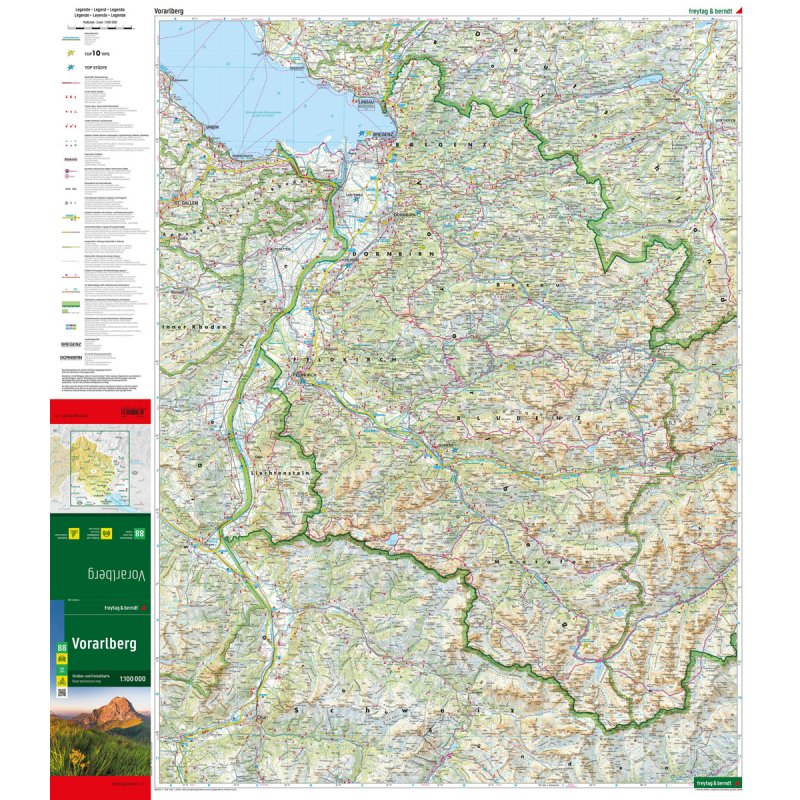 Mit der Straßen- und Freizeitkarte Vorarlberg im Maßstab 1:100.000 finden sich Urlauber die mit Auto, Motorrad oder Wohnwagen unterwegs sind bestens zurecht. Das weit verzweigte Straßennetz ist exakt abgebildet, alle wichtigen Radrouten, Entfernungen und viele Ausflugsziele sind in der Karte eingezeichnet.