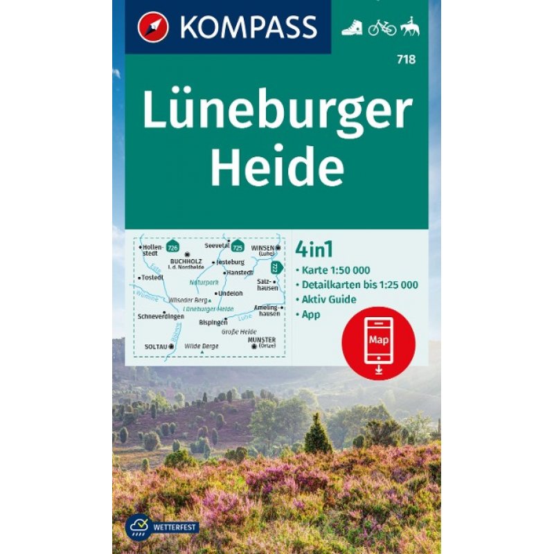 KOMPASS Wanderkarte Lüneburger Heide, 718, 1:500004in1 Wanderkarte 1:50000 mit Aktiv Guide und Detailkarten inklusive Karte zur offline Verwendung in der KOMPASS-App. Fahrradfahren. Reiten.