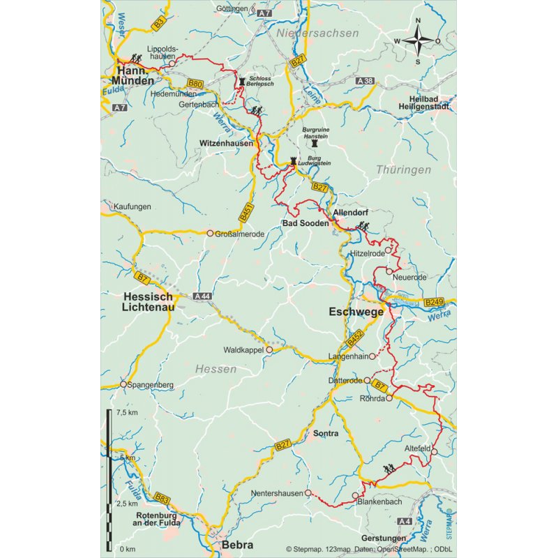 In der für ihre prächtigen Fachwerkgebäude mehrfach prämierten Stadt Hann. Münden beginnt mit dem ca. 133 km langen Werra-Burgen-Steig ein Wandererlebnis, dass auf bemerkenswerte Weise Natur, Kultur sowie Kunst miteinander verbindet. Bereits der Start ist außergewöhnlich: nämlich dort, wo sich die Werra gemeinsam mit der Fulda in der Weser verliert. Aus Sicht der Wanderer ist hier aber nicht das Ende des Flusses, sondern vielmehr dessen Beginn. Nach nur wenigen Kilometern ist die Grenze von Niedersachsen zu Hessen überquert und die waldreiche Mittelgebirgslandschaft Nordhessens präsentiert sich mit faszinierenden Aus- und erhabenen Einblicken. Der Werra-Burgen-Steig macht schon bald seinem Namen alle Ehre: das traumhaft schöne Schloss Berlepsch eröffnet den Reigen an altehrwürdigen Gemäuern. So wird deren wechselvolle Geschichte unmittelbar erlebbar. Andererseits sind es aber auch die reizvollen Aussichten auf entfernter liegende Burgen und Schlösser, die eine große Faszination ausüben. Dabei schweifen die Blicke immer wieder von luftigen Felsen hinab ins Werratal mit saftigen Wiesen und kleinen Dörfern. Bis die Tannenburg bei Nentershausen erreicht ist, laden historische Fachwerkstädte mit ihren Landgasthöfen und Hotels zu romantischen Aufenthalten ein.