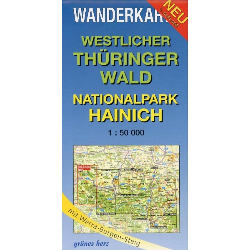 Thüringer Wald und Nationalpark Hainich sind zwei Begriffe für eine besondere Landschaft und Naturschönheiten, die ein vielfältiges touristisches Angebot versprechen. Der Hainich gilt als das größte zusammenhängende Buchenwaldgebiet Mitteleuropas, und ihm wurde daher der höchste Schutzgrad als Nationalpark zuteil. Thematische Wanderwege und Lehrpfade - aber insbesondere der schon weit über die Region hinaus bekannte Baumkronenpfad - lohnen einen Besuch. Den westlichen Thüringer Wald prägen, im Gegensatz zu anderen Teilen des Thüringer Waldes, zahlreiche Mischwälder. Der Große Inselsberg mit seiner hervorragenden Rundsicht in 916 m Höhe ist die markanteste und bekannteste Erhebung, wenn auch nicht die höchste. Und der Höhenweg des Thüringer Waldes, der 168 km lange Rennsteig - beginnt hier in Hörschel an der Werra seinen Lauf in Richtung Blankenstein an der Saale. Geschichtsträchtig ist die Region obendrein - dies widerspiegelt sich schon in den klangvollen Namen von Wartburg, Eisenach, Creuzburg, Bad Salzungen, Schmalkalden oder Wasungen. Man begegnet hier Schritt auf Schritt den unterschiedlichsten historischen Zeitzeugen und imposanten Sehenswürdigkeiten. Im Kartenbild ebenfalls ersichtlich sind große Teile des thüringisch-hessischen Werratals sowie der Thüringischen Rhön. Die Werra, einst in großen Abschnitten die unüberwindbare innerdeutsche Grenze, verbindet heute Hessen und Thüringen miteinander. Großer Beliebtheit erfreuen sich der den Flusslauf folgende Werratal-Radwanderweg sowie der Fluss selbst bei den Wasserwanderern. Diese in der Karte dargestellten vier prägnanten Landschaftsteile versprechen einen hohen Grad an Abwechslungsreichtum. Die Wanderkarte stellt neben dem westlichen Thüringer Wald und dem Nationalpark "Hainich" auch große Teile des thüringisch-hessischen Werratals